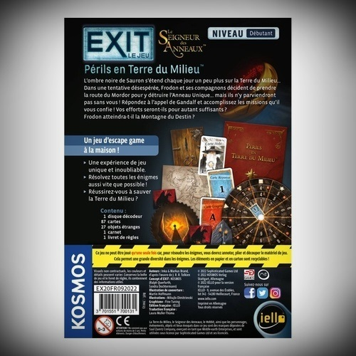 Exit : Seigneur des Anneaux - Périls en Terre du Milieu est un jeu coopératif qui reprend les sensations des "Escape Games". Muni d'indices, de matériel et d'un décodeur, vous aurez pour mission de sortir du jeu le plus rapidement possible.